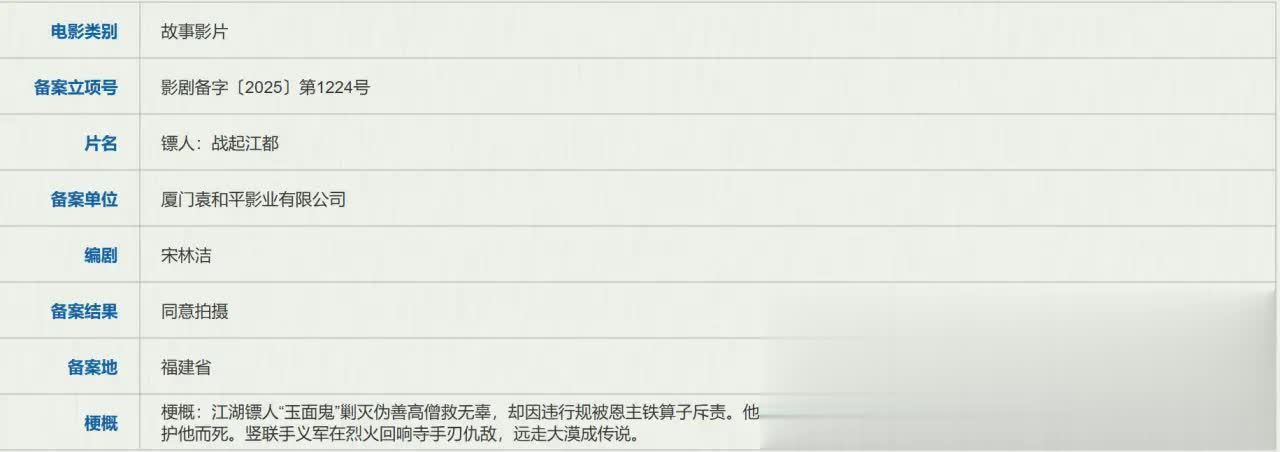 《镖人:战起江都》(也就是《镖人2》)去年就已经备案。备案地为福建省,和《镖人》一样。备案单位依然是厦门袁和平影业有限公司,备案结果为同意拍摄。