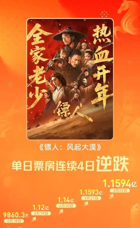 《镖人》不负众望,凭借过硬品质和观众认可,单日票房连续4日逆跌,不出意外的话2月23日将再次实现逆跌,之后排片占比会继续上升,最终票房预测已经超过13亿。
