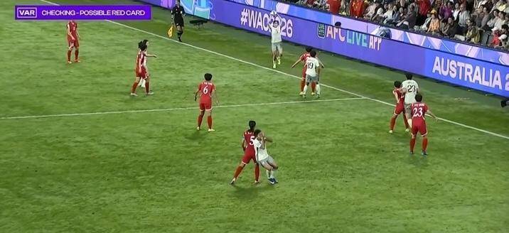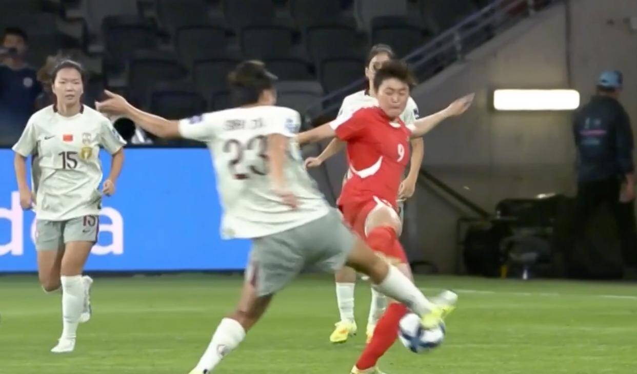 比赛一开场,朝鲜女足就给了中国女足一个下马威,金成京在中场附近拼抢球权时,直接一脚踹在了中国队前锋邵子钦的膝盖上。起初当值主裁只判罚了普通犯规,但是场外的视频裁判介入后,认定金成京的动作是一次鲁莽的暴力犯规,完全可以向她出示红牌!不过主裁判在亲自回看录像后,却只给了金成京一张黄牌,朝鲜女足成功逃过一劫!